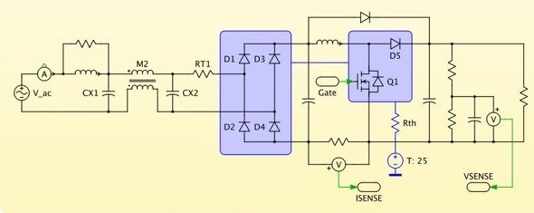図2はPFC電源の整流部の参考回路図だが米国の資料と思われる。左側にAC電源を接続しノイズフィルターと突入電流防止のパワーサーミスター(RT1)を通しダイオードブリッジで交流を整流。チョークコイルをFETでスイッチングして、発生した逆起電力で電解コンデンサーを充電し、DC385Vの整流電圧を生成していた。