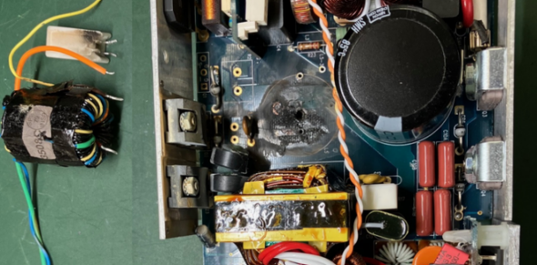 PFC回路の弱点は、チョークコイルで生成した電流で電解コンデンサーを高周波で充電していることにあった。電解コンデンサーのESR(内部等価抵抗)に高周波電流を流すと電解コンデンサーの温度が上昇し、内部の電解液が揮発して10年程度の稼働で容量が低下してしまう。容量が低下しても、電源は装置の内部の負荷へ電力を供給しているため、AC電源から取り込む電流量が徐々に増加する。その結果、チョークコイルを駆動しているFETの電流量が増えて、過電力になってFETは過熱して短絡破損してしまう。