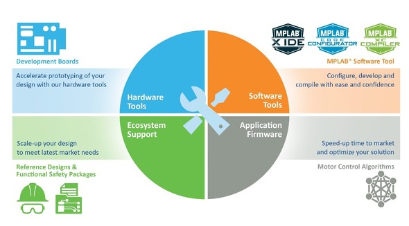 Microchip社はモーター制御向けに、ハードウェアサポートや高度なアルゴリズムを含む包括的なソリューションを提供しています。そのポートフォリオにはMCUやゲートドライバー、パワーエレクトロニクス、センサーが含まれており、その全てがモーターの性能を最適化するように設計されています。