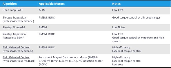 モーター制御システムの最適化に欠かせないのがアルゴリズムです。AC誘導モーターのV/F制御のような従来の手法は、コスト効率が高く単純ですが、最高の効率が提供されるとは限りません。BLDCモーターやPMSMモーター向けの6ステップ転流をはじめとする高度なアルゴリズムは、より優れたトルク制御を実現し、センサー付きまたはセンサーレスで実装できます。最も効率的なのはFOC(界磁制御)で、高効率、低ノイズ、優れたトルクおよび速度性能を備え、モーターの種類とアプリケーション要件に応じて、センサー付きまたはセンサーレスで実装できます。