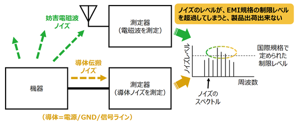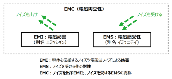 ノイズを出すEMIと、ノイズを受けるEMSの総称(ノイズによる妨害とノイズを受ける側の耐性の総称) |