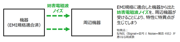 EMI規格には適合出来ていますが、妨害電磁波が他機器に影響を与えてしまうケースです。