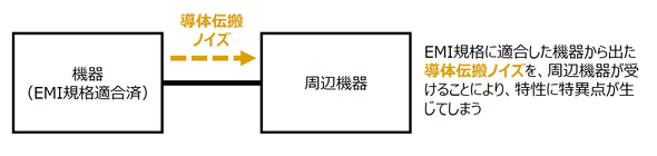 EMI規格には適合出来ていますが、導体(電源、GND、信号ライン等)を伝搬するノイズが他機器に影響を与えてしまうケースです。