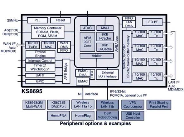 ただ逆に言えば、携帯電話(やその後のスマートフォン)を別に考えると、ARMコアがEmbeddedマーケットでそこまでシェアが大きかったか?というとそれほどでも無い。もちろん、幾つか採用事例はあった。ネットワーク分野で言えば、2000年頃の格安ブロードバンドルーターにSamsungのARM7TDMIベースのSoC(System on Chip)がコントローラーで使われていたし、LinksysのBEFSR41はKENDIN Communications(2001年にMicrel Incorporatedに買収され、そのMicrelも2015年5月にMicrochip Technologyに買収された)のKS8695(図1)というARM922コアのSoC(図2)を搭載していた。ただ主流だったか?というと結構怪しく、どちらかといえば性能より低消費電力性を買われていたというケースが多かった。それでもNetworkに関して言えばIntelがXScaleコアを使ったSoCを2002年頃からリリースしていたが、結局同社は2006年にXScaleの資産を丸ごとMarvellに売却してしまい、その先が続かなかった。で、2000年前後に性能が必要な用途に使われていたのがMIPSとx86である。x86はPCそのままだから、性能は出るものの消費電力も大きく、コストも高い。そんな訳でハイエンドはx86ベースがそれなりに使われていた※1)が、この時期に高性能/低消費電力&低価格向けに比較的多く採用されていたのがMIPS 32/64であった。