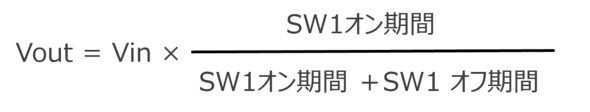 出力電圧はSW1がONしている時間の電力を平滑化しますので、SW1がONする時間、比率が高い程高くなり、比率が低いと低くなるというように、ON/OFFの比率で決まります。つまり全体の時間のうち、どれだけONしているかデューティー比をコントロールすることで、電圧を調整しています。これを示した式が下記になります。