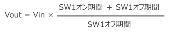 SW1がONしている時間にコイルにエネルギーを蓄積し、OFF時にコンデンサーに供給しますので、ON時間が長い分電圧を上げるという関係になります。仮に変換の効率を100%とすると、入力の電力は、出力の電圧が上がった分、負荷に流せる電流は反比例して小さくなります。さらに効率を考えますと、昇圧を行った際、意外と電流が取れないというケースも結構ありますのでご注意ください。