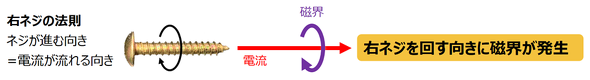 フランスの物理学者アンペールさんが発見した右ネジの法則のとおり、磁界は、電流が流れている物(コイルや基板配線など)の回りに、右向きに円を描くように発生します。